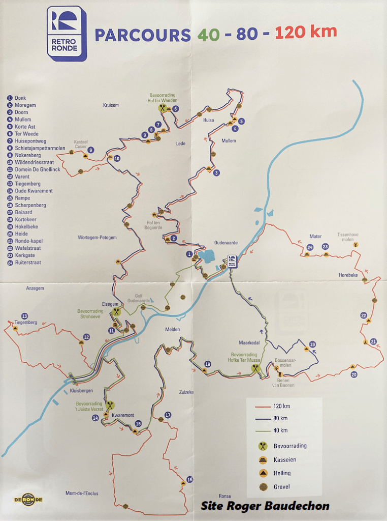 Pour les amateurs de « TOUR DES FLANDRES », voici la carte du « RÉTRORONDE » 2023. Cet événement VINTAGE ou ÉROICA est fort prisé par les « mordus ». Le vélo en acier et la tenue d’avant 1980 est obligatoire. Le samedi, c’est la randonnée « PATERBERG-KOPPENBERG » (+/- 30 km) – nous y revenons dans un prochain post. Le dimanche, ces deux monts ne sont pas dans les circuits de : 40-80-120 km. Avec un « vieux » modèle (généralement 5 vitesses avec manettes sur le cadre et une selle en cuir), un équipement hors du temps (maillot en laine et cuissard avec peau de chamois à badigeonner de crème pour éviter les irritations) vous comprendrez combien c’est hard. #PlusLaForteChaleur!!!