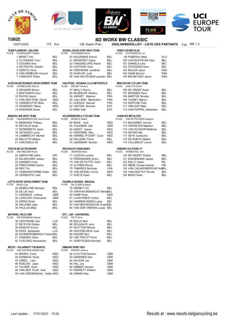L’épreuve de TUBIZE a su évoluer. En effet, elle devient 1.2. Elle ne compte pas arrêter en aussi bon chemin. En outre, la physionomie sera totalement différente. C’est la fin des circuits comme une kermesse. Place à une ligne et des rondes locales. La ville de TUBIZE étant toujours le lieu de départ et d’arrivée de la « SD WORX BW CLASSIC ». Pour sa première édition, la journée fut plaisante. REX avait enlevé le bouquet chez les messieurs et DRUYTS avait fait de même chez les dames. Ces dernières sont également dans le programme. Le 19 juillet, c’est déjà demain !!!