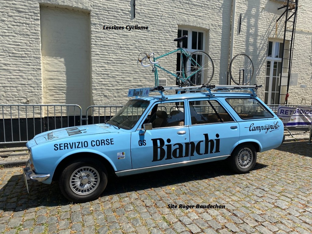 N’étant pas totalement des spécialistes, ces clichés ont soulevé quelques interrogations. En effet, durant la saison 1979, « BIANCHI-FAEMA » semblait posséder un charroi de véhicules de la marque « CITROEN ». Présentement, c’est une « PEUGEOT ». Mais, nous savons que « PEUGEOT » a racheté « CITROEN » en 1976. L’organisateur du « TOUR DE FRANCE » aurait-il imposé son sponsor automobile le temps d’une épreuve nationale ? Par ailleurs, en 1979, plusieurs teams sont équipés de « PEUGEOT ». La question reste posée. Pourrait-il s’agir d’une reconstitution (in)exacte ?. Par contre, la plaque avant semble originale. Nous avons plusieurs clichés relatifs à des expositions visitées ces dernières années. Le modèle est presque identique. Finalement, ces recherches enlèvent un peu de rêve à la grande histoire du cyclisme. La couleur des équipements – VERT/ROUGE – est extra !!! Les vélos verts « maison » sont magiques. Enfin, souvenons-nous des coursiers de « BIANCHI-FAEMA GS » 1979 : CAVALCANTI-CONTINI-DE MUYNCK-DONADELLO-GIMONDI-KNUDSEN-LODER-LUALDI-MACCALI-PARECCHINI-PARSANI-POZZI-SANTONI-les VAN LINDEN. Au palmarès (en bref) : 1er « TIRRENO-ADRIATICO », 5e « GIRO », 2e « TOUR DE LOMBARDIE », 3e « MILAN – SAN REMO », … . « BIANCHI » (fondateur Edoardo BIANCHI) a été sponsor (principal ou adjoint) d’un coureur ou d’un groupe cycliste depuis la fin du 19e siècle. En 2017, l’entreprise a été rachetée par « CYCLEUROPE » qui appartient à la société suédoise « GRIMALDI ». Depuis 2017, « BIANCHI » et « FERRARI » collaborent à la fabrication de cycles de luxe.