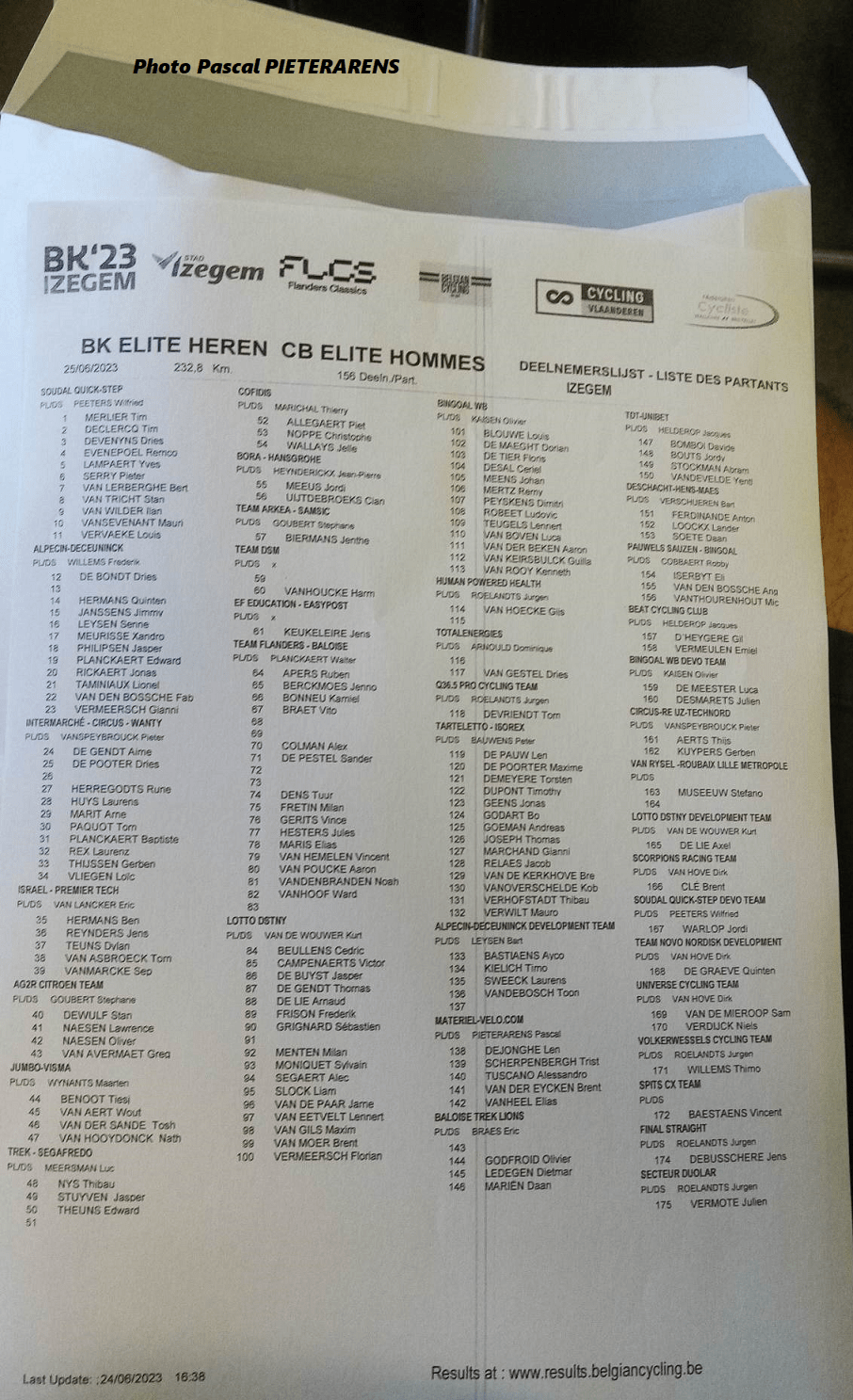 Le briefing des directeurs sportifs vient de se dérouler à Izegem. Les consignes et autres informations ont été communiquées à Pascal PIETERARENS pour son équipe « MATÉRIEL VÉLO-COM » – cinq coureurs. La liste fait apparaître le nom de 156 participants. Comme de coutume lors des NATIONAUX, les blocs ne sont pas équivalents.