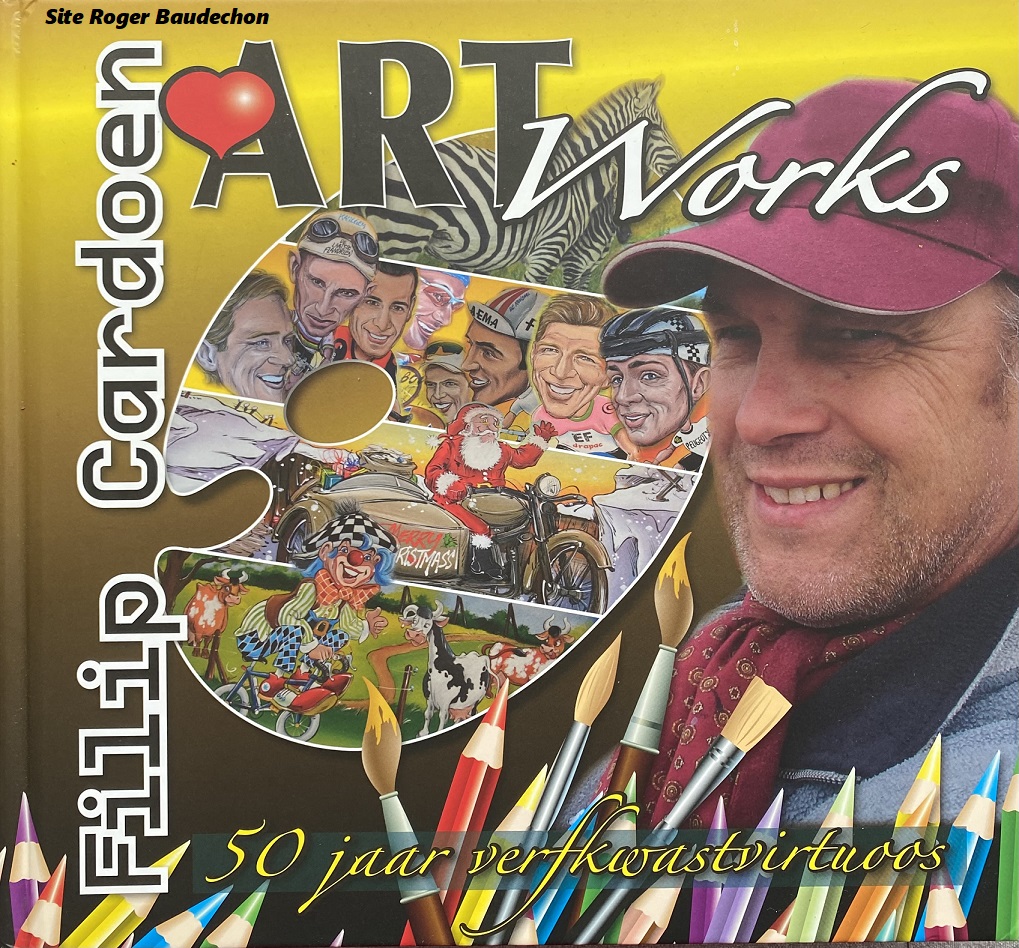 L’ouvrage a une forme carrée de 27 x 27 cm. Il a une épaisseur de 2,5 cm. Les pages de couverture sont en carton épais. L’intérieur est en papier glacé de qualité. L’auteur est Filip CARDOEN. Les textes sont de Peter DEVLIEGER. La vérification de la rédaction de Riet VANHAVERBEKE. Pour la vente, c’est Geert DERAEVE et pour les aspects techniques, Jan INGELBEEN. Il a été imprimé par « MEDIATOPPER » (2018). En réalité, ce bouquin reprend la biographie de Flip CARDOEN lui-même. Sa naissance, sa vie de famille, ses enfants (une fille aux J.O en VOLLEY), ses parents, ses amis et surtout, une petite partie de ses œuvres. Il a débuté par des paysages, des animaux, la nature, la guerre, … . Il a presté pour des journaux (« TRENDS », « KNACK », « ROULARTA », …), des particuliers, des commerces (vitrines, panneaux, …) et des associations caritatives (« KLOEN »). CARDOEN a effectué trois ans d’études à « SAINT-LUC » – RAMEGNIES CHIN (Tournai). Le seul néerlandophone de sa classe (dixit). Pour en connaître plus sur son travail, nous vous invitons à lire l’ouvrage de 272 pages. Il n’est pas exclusivement centré sur le cyclisme mais toutes les caricatures présentées sont très plaisantes. #+BonneAction!!!
