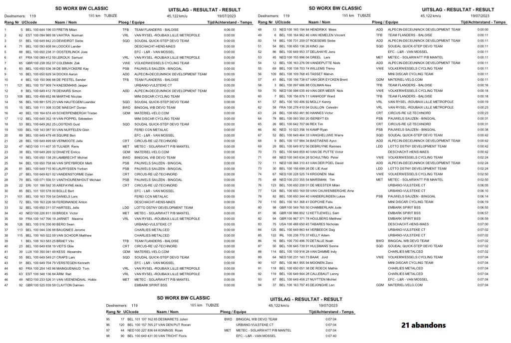 La course a été menée tambour battant. 185 KM en 04h06, soit à du 45,122 de moyenne. Lorsque nous les avions vu passer une première fois à Clabecq, le doute n’était pas permis. Par la suite, le rythme restait soutenu. Malgré un vent très costaud, la file indienne était souvent de mise. Le meilleur moyen de terminer en beauté consistait à rester dans les roues et à s’accrocher. Au bout du bout, Milan FRETIN remporte le bouquet devant VAHTRA et DEWEIRDT. Plusieurs coureurs cités sur ce site confirment leur bonne condition actuelle. Bravo au vainqueur et aux organisateurs. La troisième édition serait déjà sur les rails. #Top