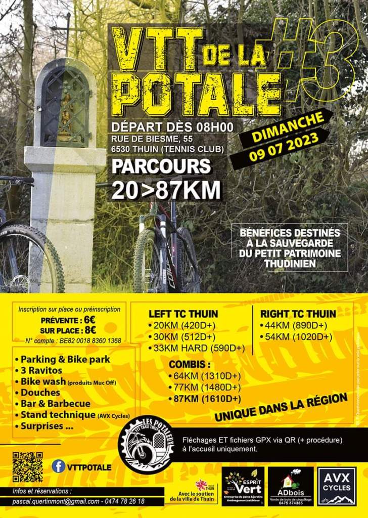 Le « VTT TEAM LESSINES » a assuré une présence au vtt de « LA POTALE » – THUIN – en date du 09/07/2023. Etaient de la partie : OlivierM, ArnoldD, Lars, Mario, StéphaneB, Claude, Eddy, Max et DavidL. Il nous rapporte que la Rando était TOP, de même que le fléchage. Ravitos supers. Il y avait 534 inscrits. De plus, c’était pour une bonne cause.