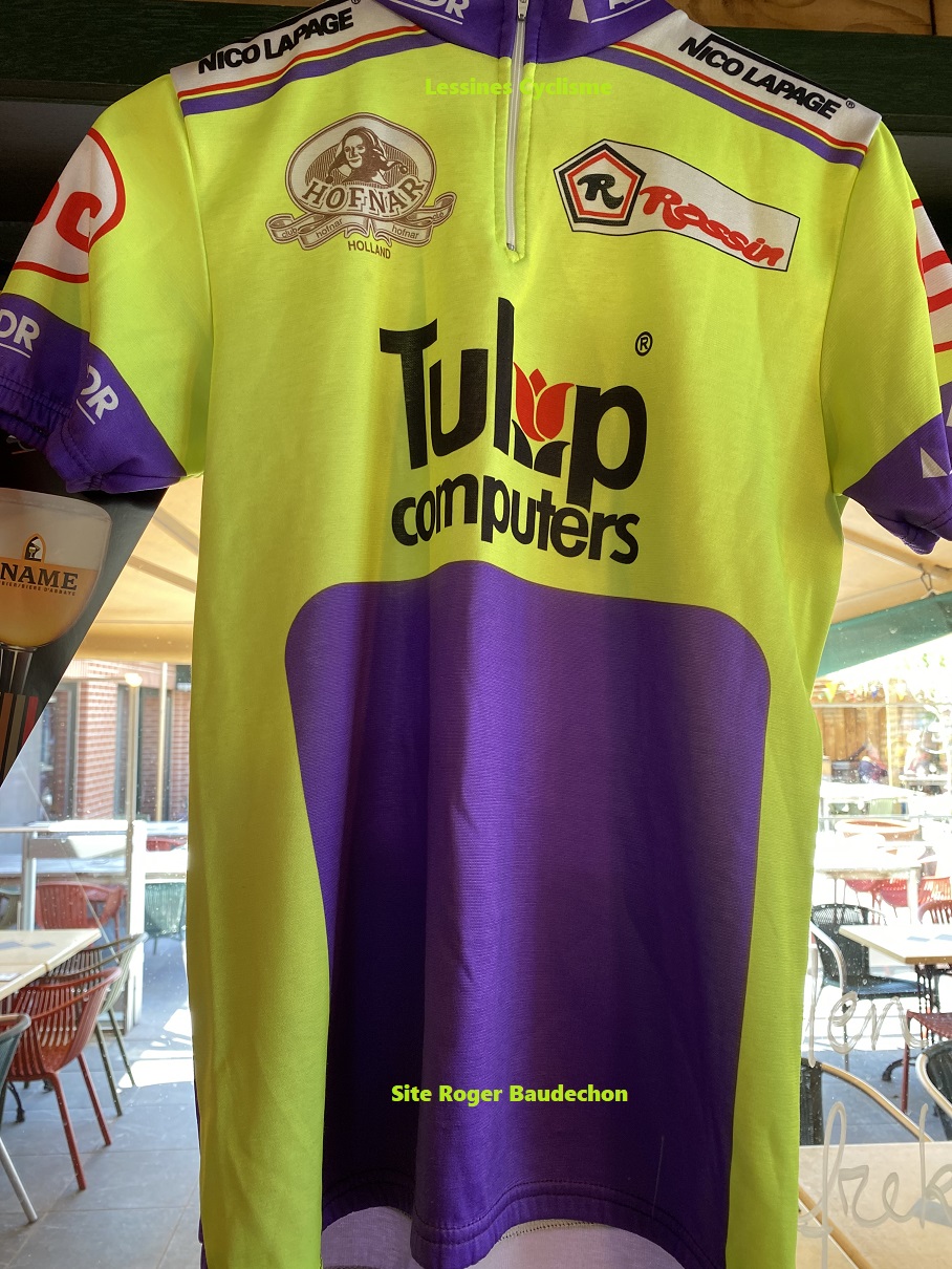 Le maillot de l’équipe « TULIP – IOC – HOFNAR » trône en bonne place dans la salle principale. Nous avions un doute. Les couleurs « ADR » et la marque « TULIP ». Après quelques recherches, c’était bien en 1990. En même temps, il y avait une autre équipe « TULIP COMPUTERS » en Espagne (rouge-blanc-noir). En 1989, « ADR » avait des maillots identiques. En 1991, ceux du TEAM « TULIP » étaient verts.
