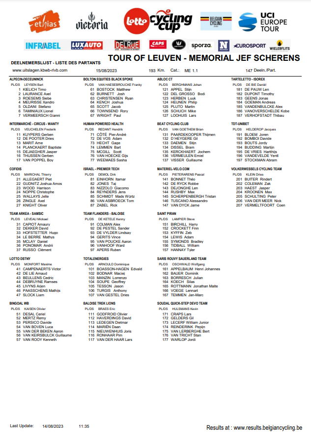 La « LOTTO CYCLING CUP » en sera à son avant-dernière manche avec le « TOUR OF LEUVEN »-« MEMORIAL JEF SCHERENS » 1.1. LOUVAIN accueille la compétition en date du 15/08/23. Une partie de manivelles qui se déroulera dans le Brabant Flamand. Leuven étant son chef-lieu. De nombreuses équipes voudront se montrer à leur avantage avant d’entamer les derniers mois relativement chargés.