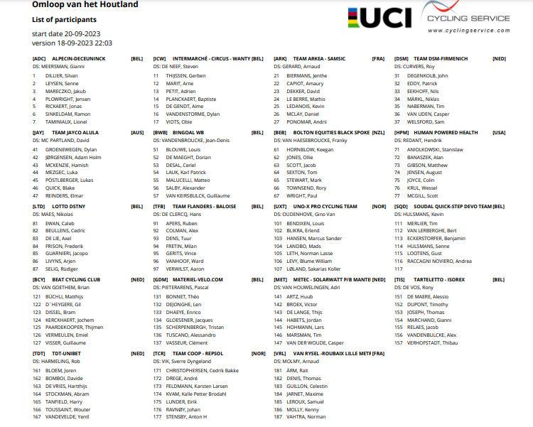 1 THIJSSEN 2 GROENEWEGEN 3 BEULLENS … 4 MARIT 5 MOZZATO 14 EECKHOFF 22 DE MAEGT 23 VAHTRA 30 DEGENKOLB 32 LAUK 38 VANDENSTORME 40 APERS 43 CAPIOT 49 LEROUX 57 LEYSEN 60 BOMBOI 62 PETIT …