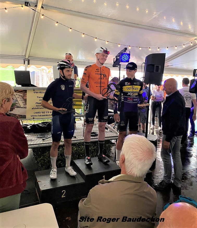 Avec une cinquantaine de participants et quelques gros bras, il ne fallait pas la jouer au plus fin. Pour certains, tenir les roues semblait déjà bien compliqué. Nous n’entrerons pas dans les détails mais sachez que l’épreuve fut menée à un rythme effréné. Premier tour, une échappée. Ensuite, des cassures. De petits groupes se forment. Une quinzaine d’entre eux passent à la trappe. Dans le dernier tour, la course durcit encore avec un vent violent accompagné du ciel qui nous tombe sur la tête. La super drache. Finalement, le norvégien STRAND PEDER DHAL (22 ans-« UW IMMO PLUS-PESSEMIER ») remporte le bouquet légèrement détaché (9 victoires). VAN POPPEL (22 ans-« MINIDISCAR ») est second. Il est de plus en plus dans le visuel en 2023 (4 victoires). Quant au troisième, il s’agit de Milan LANHOVE (19 ans-« VANEYCK SPORT »-2 victoires). Notons la bonne performance de David DESMECHT 7e, Justin PICOUX 20e, Aurélien BIEBUYCK 31e, … .