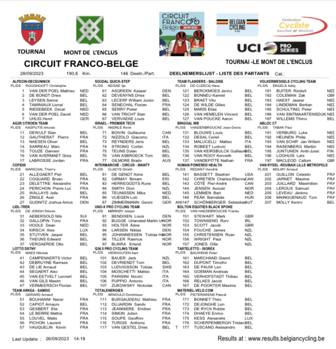 Enfin !!! Il est vrai que le « CIRCUIT FRANCO-BELGE » version 2023 aura connu bien des péripéties. Heureusement pour les amateurs de cyclisme, les organisateurs n’ont pas baissé les bras. C’est donc, le jeudi 28 septembre que vous pourrez assister aux hostilités. Mathieu VAN DER POEL est en tête de gondole. #BravoPourLeNouveauSite!!!