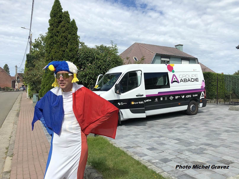 Photo. Ce supporter est ABSOLUMENT partout. Vous venez de le voir en TV lors du CLM mixte à DRENTHE (P-B). Cette année, nous l’avions vu à ROUBAIX, MOUSCRON, … , à ZOTTEGEM. Il est acharné mais aussi pratiquant. A ZOTTEGEM, il donnait les bidons pour l’équipe du « TEAM GROUPE ABADIE » dames.
