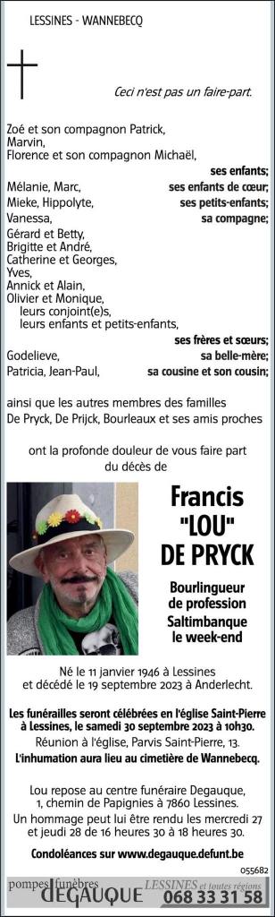 Il avait 77 ans et une renommée INTERNATIONALE. Francis DE PRYCK, alias « Lou », est un enfant de Lessines. Il est décédé à Anderlecht en date du 19 septembre 2023. (le même jour que notre mère)