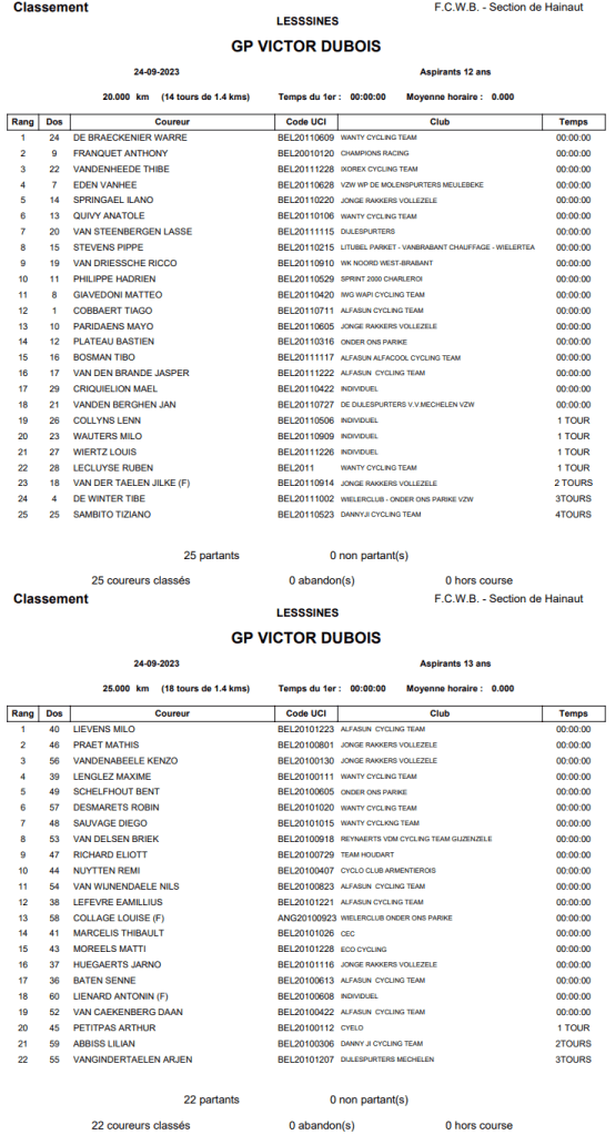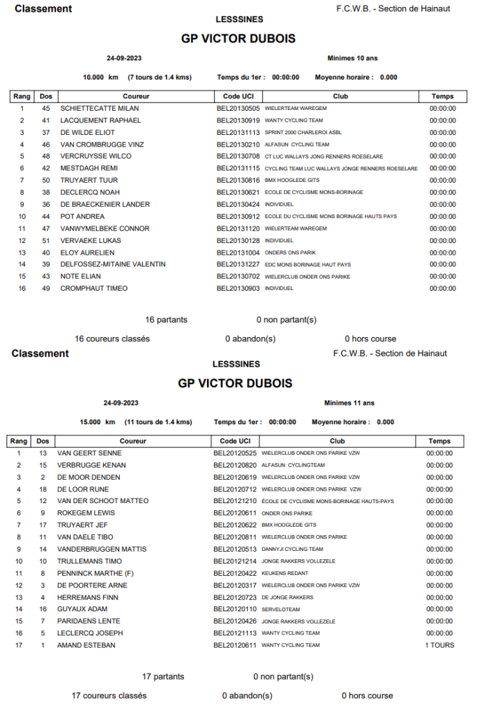 Voici un aperçu des classements du « GP DUBOIS » qui s’est déroulé à HOURAING (24/09). Dans l’incapacité d’être présent toute la journée, il a été porté à notre connaissance que les locaux s’étaient bien comportés. Les courses ont été rondement menées. Il y a déjà quelques costauds très réguliers qui montrent le bout du nez dans le haut des classements.