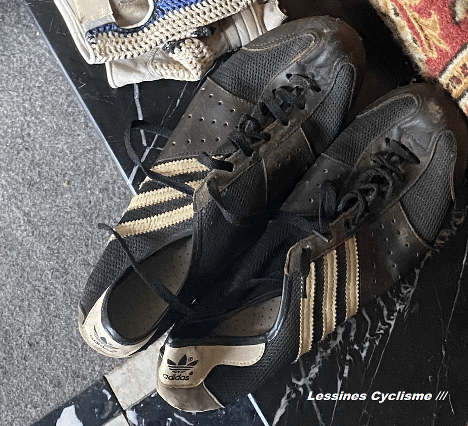 >>> Chaussures de la marque « ADIDAS ». Eddy MERCKX en faisait la publicité durant les années 1970 et plus tard. Il a porté des souliers +/- semblables. Merci à Josse et Simone pour la paire qui a plus de 40 ans. Encore utilisée de nos jours.