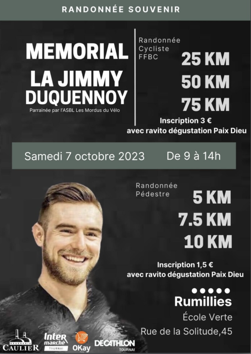Une randonnée du souvenir JIMMY DUQUENNOY est organisée à RUMILLIES en date du 07 octobre. Toutes les formalités sont dans l’entête. C’est autant pour les CYCLOS que pour les MARCHEURS. Plusieurs distances au choix – ou les deux – de 09h00 à 14h00.
