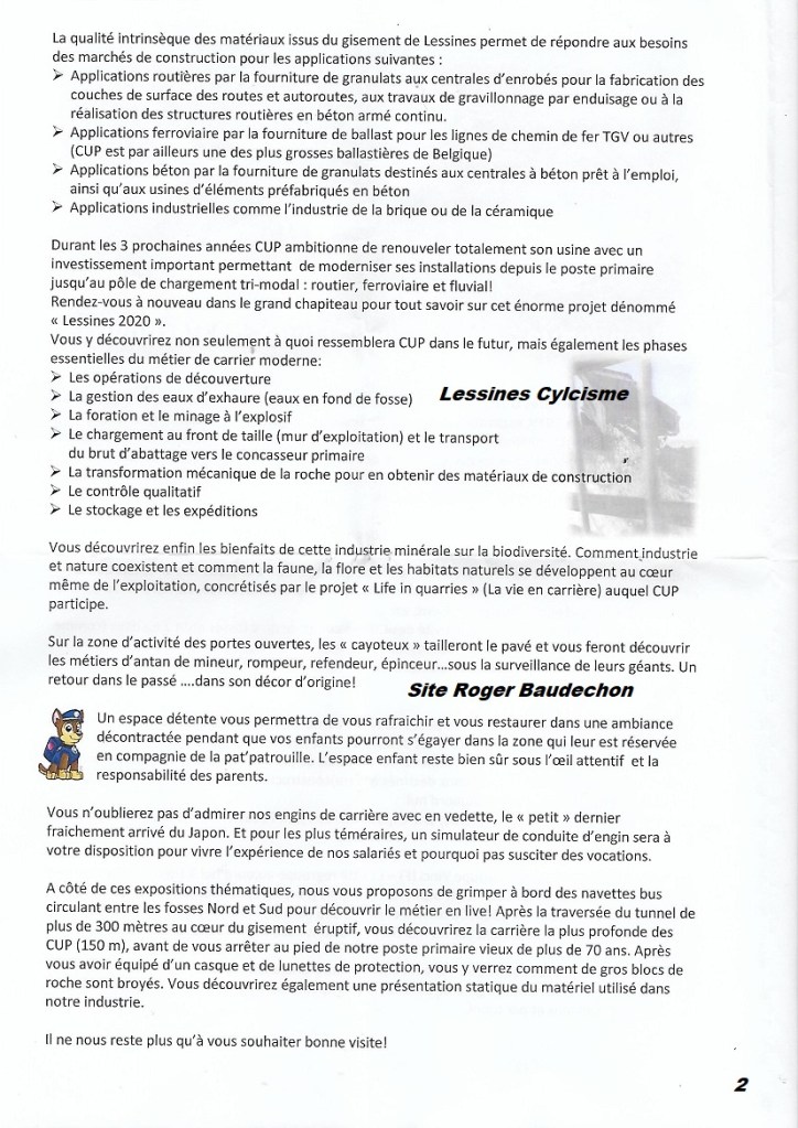 C’est peu dire que la « JOURNÉE DÉCOUVERTE ENTREPRISES » des C.U.P fut intense. Dès 09h30, les véhicules affluaient face à l’entrée administrative. Mais, c’est dans le parking situé à 300 mètres que les visiteurs devaient se rendre pour prendre le bus ou le fourgon VIP. L’accès piéton était interdit. Une fois embarqués dans les navettes, direction le centre de la terre. 1er arrêt dans la fosse côté Chaussée Gabrielle Richet. Ensuite, passage dans le long tunnel se trouvant sous la Rue de la Loge pour atteindre l’exploitation, dans la plus grande. Puis, le petit tunnel creusé sous le Chemin de Mons à Gand pour gagner le dernier trou des C.U.P. Comme des explorateurs équipés de gilets, casques et lunettes. A chaque emplacement, des animations et des panneaux didactiques. Des géants, des Cayoteux, des buvettes, des stands alimentaires, … permettaient de prolonger le plaisir. Le tout, sous un soleil généreux. Réserver deux heures de son temps était un peu juste. Il fallait bien en profiter. Les patrons carriers n’ouvrent pas souvent leurs sites. Globalement, le public était très satisfait. Pour beaucoup, il s’agissait d’une première. C’est tardivement que les grilles se sont refermées. Félicitations à l’ensemble des intervenants. (un post précédent sert de préalable)