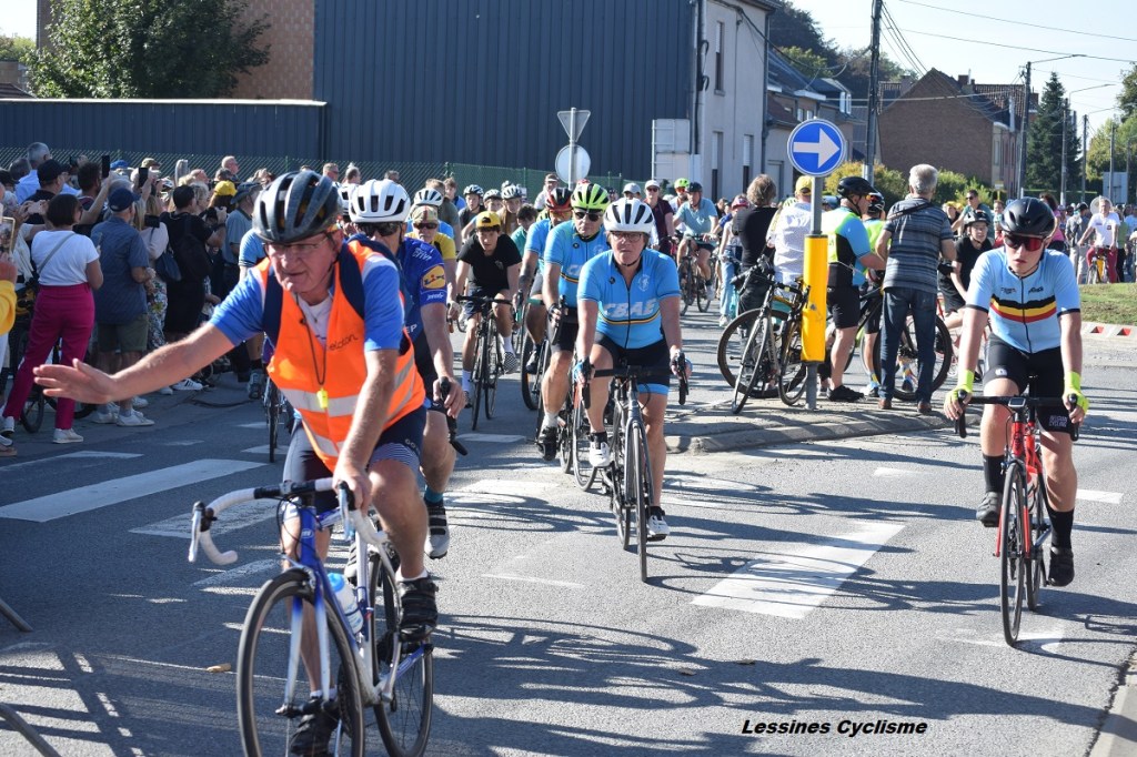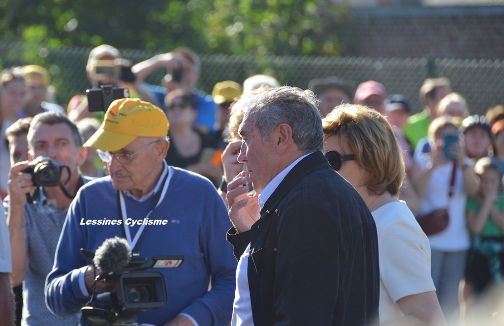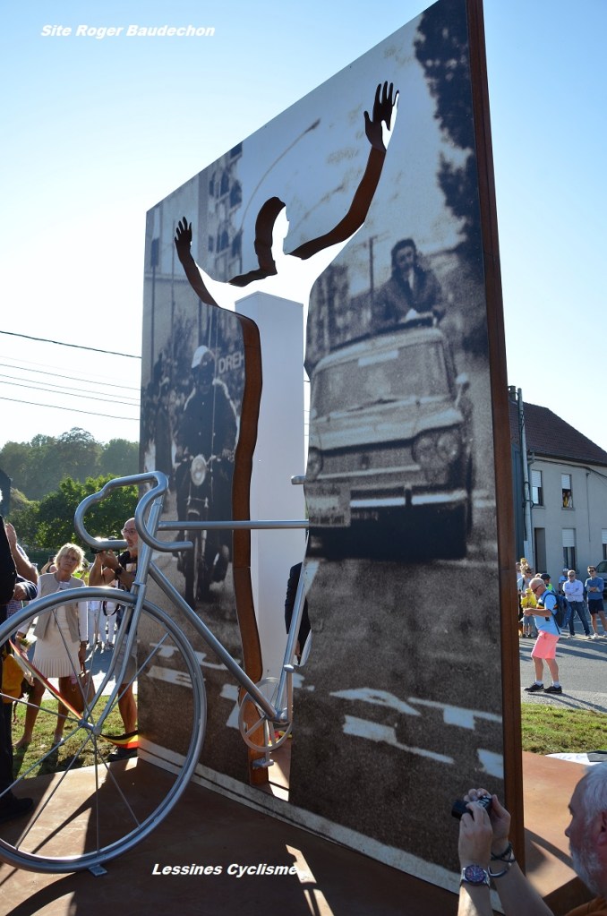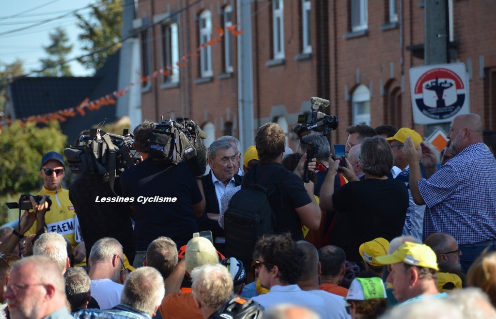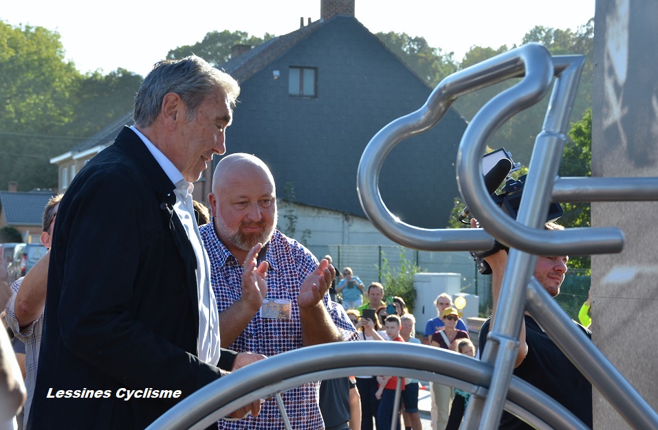Ils étaient 800 selon la sécurité, 1.000 d’après les organisateurs et 1.200 pour les mordus de cyclisme (lol). La vérité est certainement dans l’un de ces chiffres. Mais, est-ce là l’essentiel ? Il faudra surtout retenir que le 01 octobre 2023, c’était la toute grande foule qui assistait à l’inauguration de la stèle dédiée à Eddy MERCKX. Xavier PARMENTIER, l’artiste bien connu, n’a ménagé, ni ses efforts, ni son imagination. Bien aidé par la « Ferronnerie MARCEL ». La silhouette « métallique » (+/- 4 m x 2 m) découpée dans une photo d’époque nous laisse rêveur. La première victoire de la carrière du champion à Petit-Enghien – 1961 – ne risque pas d’être oubliée de sitôt. Pour les « FANS DE LA PREMIÈRE HEURE » (Merckxistes) comme pour un large public, c’était la journée à ne pas manquer. Il s’agissait d’une kermesse à l’ancienne. Echoppes, Buvettes, Podium/Speaker, Fanfare, Folklore, Vélo Disco, Voitures anciennes, Caravane Publicitaire, Cyclistes, Expo, Equipements rétros, … et un espace VIP first class. Les « CYCLOS DU BOL D’AIR » avaient mis le paquet tout comme la VILLE. Un véritable moment de bonheur. Trop court. Mme Claudine et Mr Eddy MERCKX étaient présents. C’était primordial. Ils semblaient touchés devant un tel enthousiasme à leur égard. Mr EDDY n’a pas rechigné devant les demandes d’autographes. Il a probablement signé une centaine de supports divers. Les invités étaient très accessibles. Le « cannibale » est vraiment un sportif à part. Quelle personnalité !!! Quelle classe !!! Merci à eux. Maintenant que l’excitation est un peu retombée, nous pouvons confirmer que le moment fut extraordinaire. La stèle permettra à plusieurs générations de se souvenir de cet instant, du grand champion qu’est MERCKX et de la place de Petit-Enghien dans le cyclisme. #PourLesAmateurs
