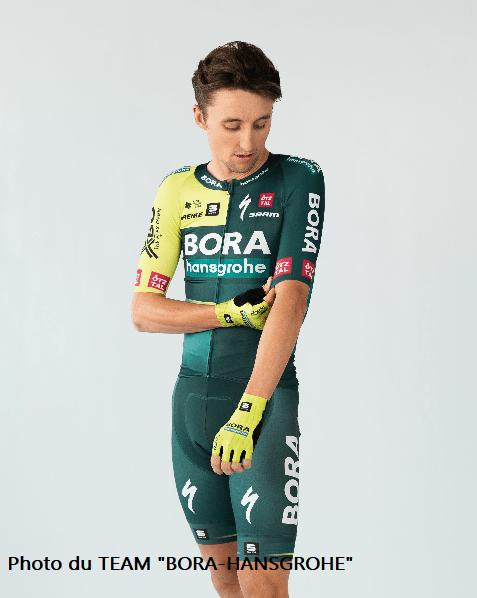 - Le plus réussi des maillots actuels est probablement celui du team « BORA-HANSGROHE ». Il reste dans la lignée des précédents mais le fluo lui va si bien !!! « SRAM » est le nouveau sponsor. « SPECIALIZED » reste le vélo attitré.