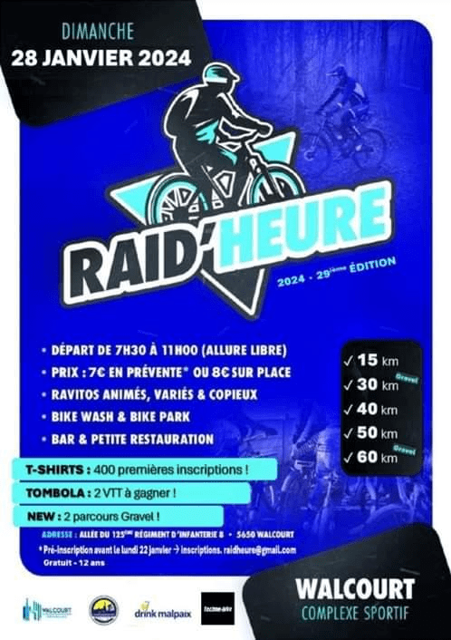 C’est parti pour une édition supplémentaire du VTT – « RAID’HEURE ». En effet, le 28 janvier 2024, c’est de WALCOURT que les vététistes pourront se lancer sur les distances suivantes : 15-30-40-50-60 km. A l’image de ce qui est devenu une habitude, la prévente permet de réduire le coût de l’inscription. Et dans ce cas, d’être dans les 400 premiers pour espérer emporter un T-SHIRT.