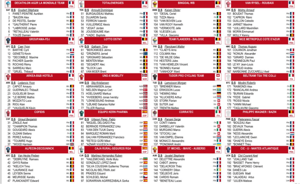 1 GENIETS 2 BAUDIN 3 VAUQUELIN 4 GAUTHERAT 5 MIQUEL 6 PACHER 7 BERCKMOES 8 PRADES 9 TRENTIN 10 GIRARD … 12 VAN MOER 16 PARET-PEINTRE 22 CAPIOT 27 VILLA 29 VERMOOTE 32 TIZZA 51 GRIGNARD 52 SEGAERT 53 DELACROIX 58 VAN BOVEN 68 GUERIN 76 LEYSEN 83 LECLAINCHE 87 SARREAU 92 MOLLY 97 MENTEN 107 BONNET 111 VLIEGEN 112 DESAL 115 DHAYE 117 PLANCKAERT ED 123 MOZZATO …