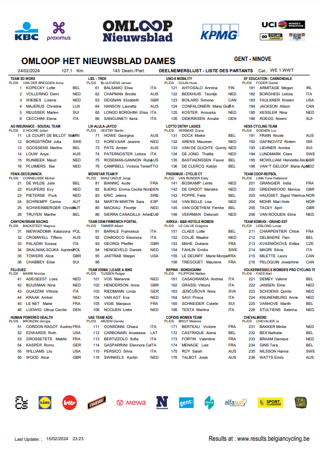 Les cyclos rouleront le 25 février 2024 dans le cadre du « TEAM LEADER CRM CLASSICS TOUR ». Presque toutes les distances démarrent de NINOVE. Seul le 150 km part de GAND. Le MUUR et le BOSBERG sont au programme. Et plus, suivant le kilométrage : LEBERG, VALKENBERG, BERENDRIES, MOLENBERG, … . Dès 07h30 ou 08h30.