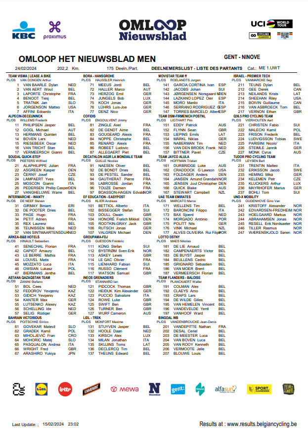 La saison belge débute dans cinq jours. La tradition veut qu’il s’agisse du « OMLOOP (HET) NIEUWSBLAD » qui ouvre les hostilités. La première des « WT » d’une longue série. Un peu partout sur le territoire, les compétitions reprennent. Nous ferons un tour du calendrier dans un prochain post.