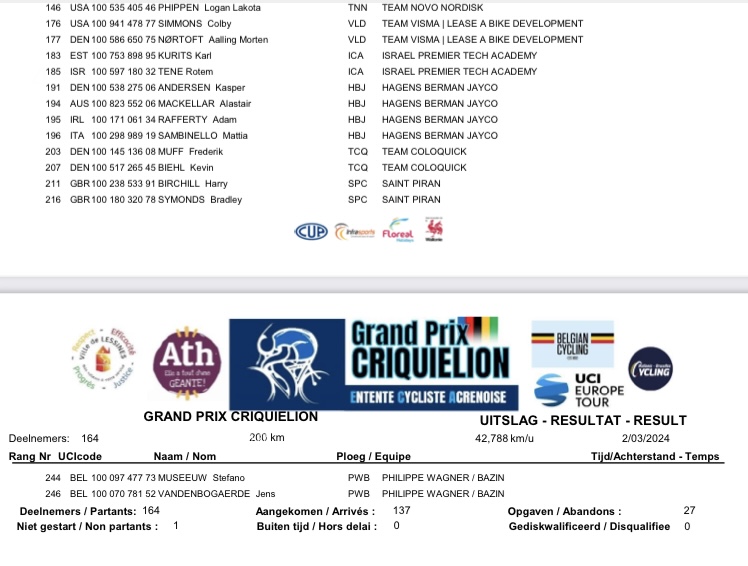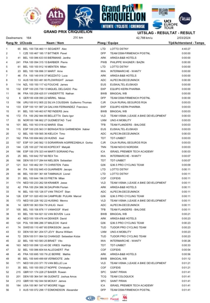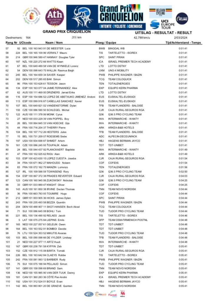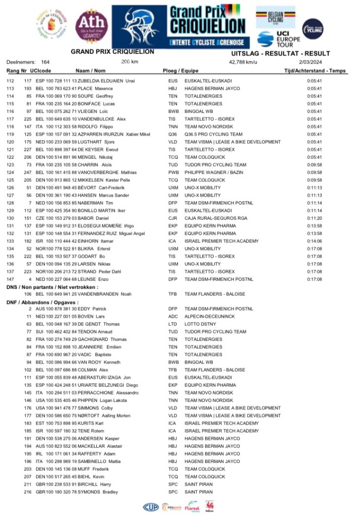 Ils étaient 164 répartis en 24 teams. Et même si la météo fut dantesque, les protagonistes ont réalisé une performance de premier choix. De ATH à LESSINES, ils n’ont pas lésiné sur le spectacle donné au public présent. Maculés de boue et trempés jusqu’aux os, les valeureux coursiers se sont battus avec acharnement jusqu’au terme de l’épreuve. Comme l’an dernier, les « DSM-FIRMENICH-POSTNL » et les « LOTTO-DSTNY » voulaient prendre la main sur le déroulement de la journée. Les prétendants étaient nombreux : BITTNER, MENTEN, COTE (déjà vainqueur sur cette même ligne d’arrivée), KIELICH, TAMINIAUX, BARBIER P, MARIT, ALLEGAERT, BIERMANS, DEKKER ou FOUCHE. Le suspens a plané sur les derniers kilomètres. Et, c’est vraiment en costaud, que Alec SEGAERT (21 ans) remporte le pavé lessinois. Une prouesse. Bravo au vainqueur. Bravo aux coureurs. Et bravo aux organisateurs. Place à l’édition 2025.