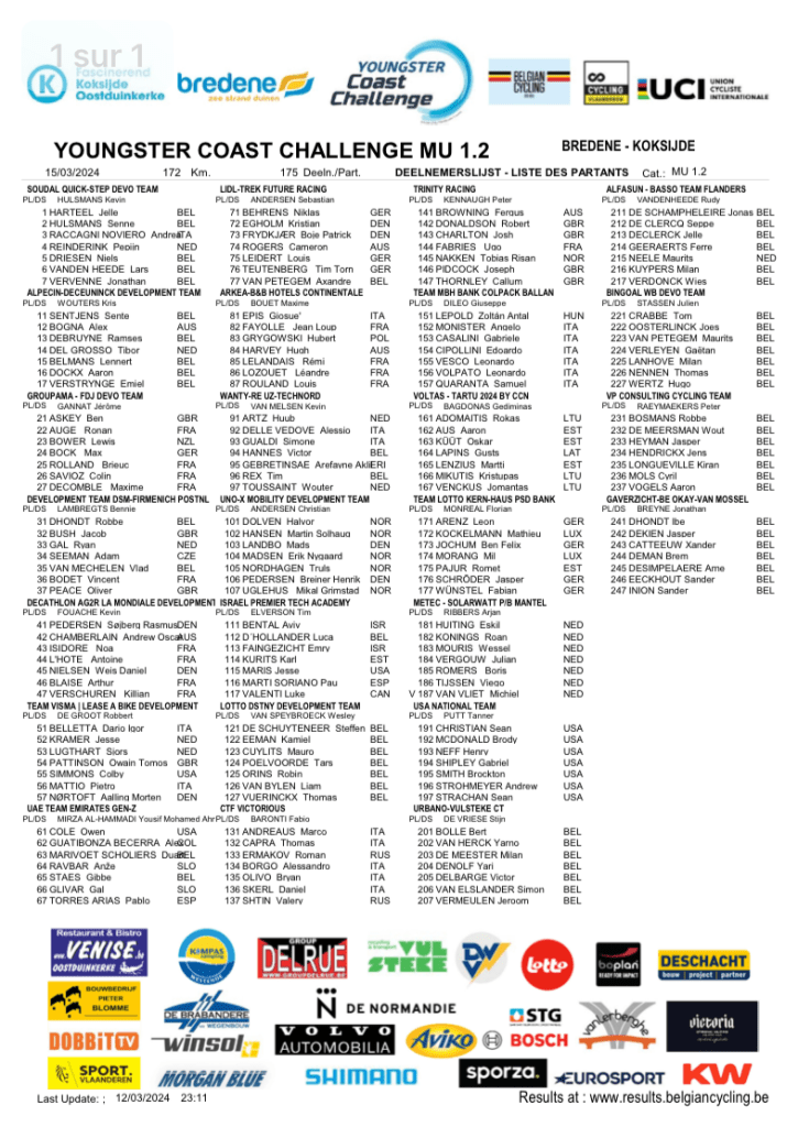 En même temps que la « BREDENE-KOKSIJDE CLASSIC » (EL), se déroule le « YOUNGSTER COAST CHALLENGE » (U23). Le 15 mars, la région de BREDENE et de KOKSIJDE fera une nouvelle fois le plein d’amateurs de cyclisme. Nous serons sur place.