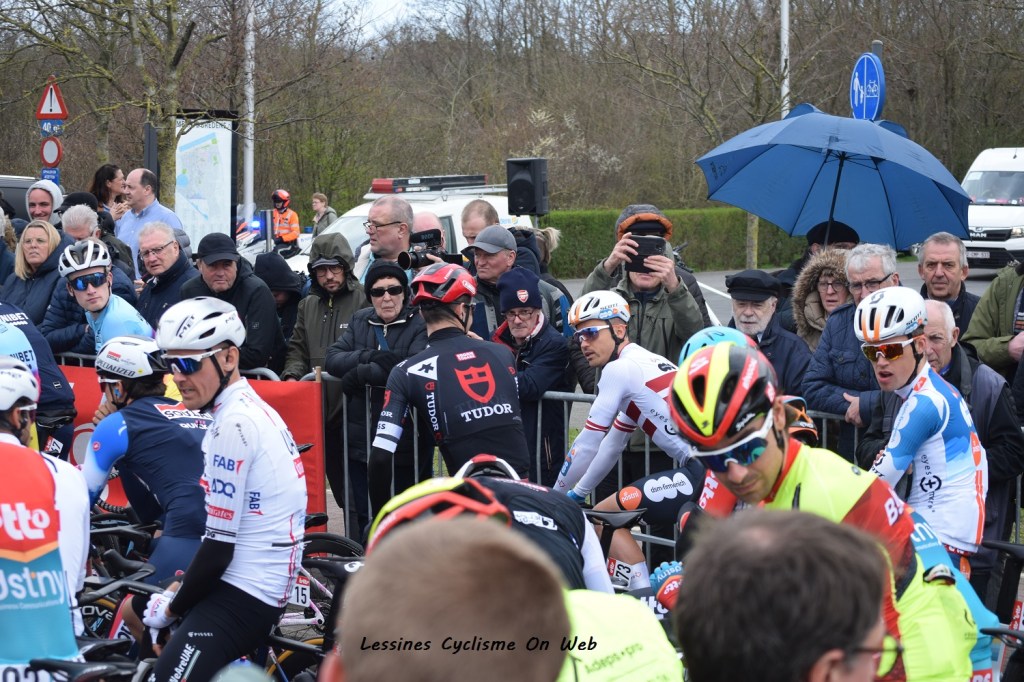 Temps frais – ciel très gris – averses. Un vendredi morose. Pourtant, le départ de la « BREDENE KOKSIJDE CLASSIC » se déroule dans une localité balnéaire. Du monde dans la salle (voyez notre remarque à ce sujet dans l’article consacré aux espoirs) et très peu à l’extérieur. Les parkings des coureurs pros sont situés directement devant le « STAFF VERSLUYS » et en bordure de la Kapelstraat. Les espoirs sont à peine partis que la présentation des pros débute. Pendant la dernière 1/2 heure, plus de gardiens, tout le monde pouvait entrer dans la salle. DE LIE, GROENEWEGEN, STOCKMAN, POLITT, TAMINIAUX, PETIT (à qui le présentateur demande s’il n’est pas trop présomptueux de rouler manches courtes …), THIJSEN, LAMPAERT, … sont fortement applaudis. Pas de temps à perdre. Direction les bus, le matos, les voitures, … .