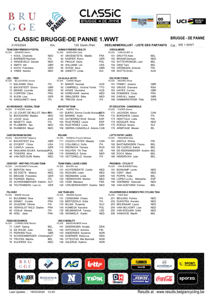 L’épreuve des dames : « CLASSIC BRUGGE > DE PANNE » se déroule le jeudi 21 mars. Celle des messieurs, le mercredi 20 mars. Deux « WT » en ouverture d’une quinzaine d’enfer.