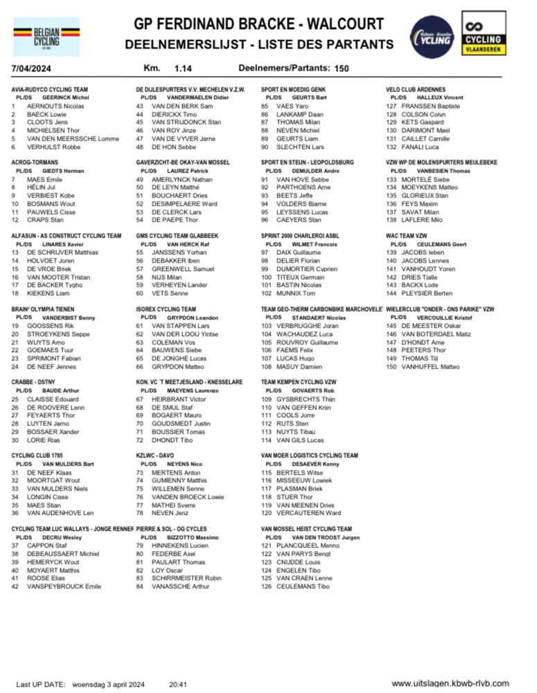 1 VAN GILS L 2 VAN MEENEN 3 VAN DEN MEERSSCHE … 4 VAN HUFFEL 7 DAIX 11 VERHULST 16 BOUCHAERT 17 DE MEESTER 19 AERNOUTS 20 DUMORTIER 29 CLAISSE 37 TITEUX 41 LOY O 45 VANASSCHE 46 PEETERS 51 BASTIN 53 DELIER 55 CRAPS. 55 finisseurs !!!