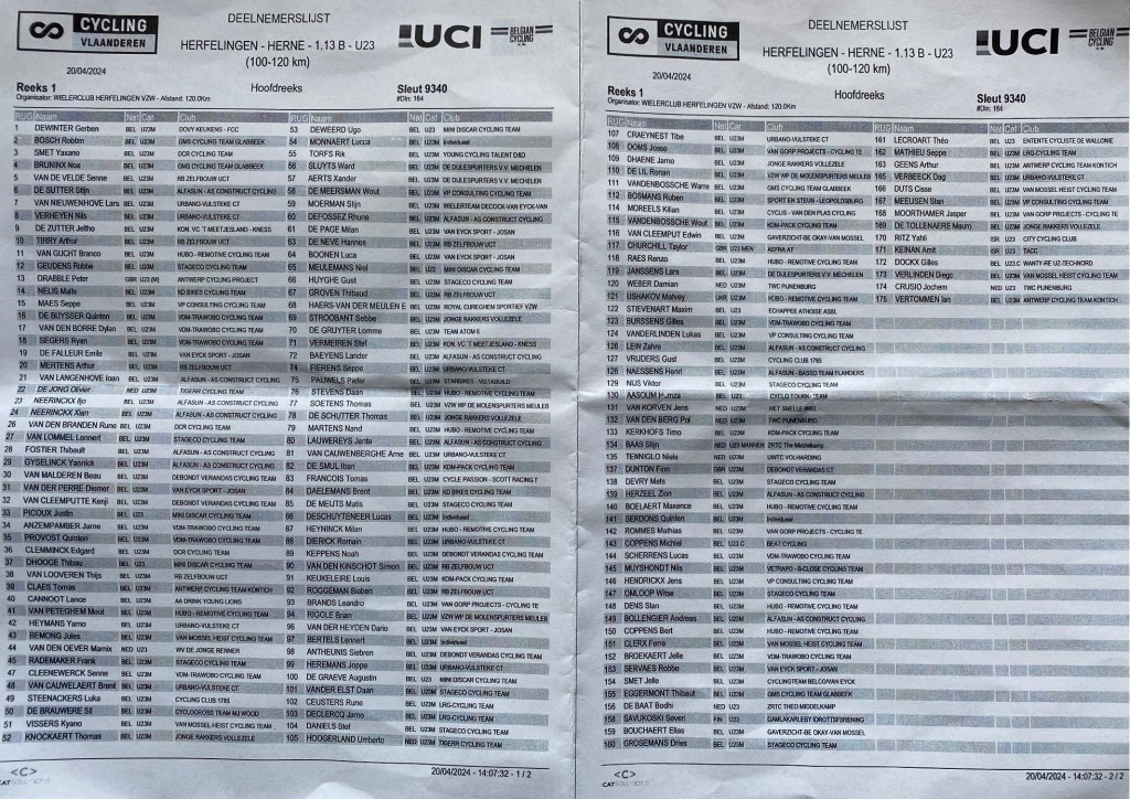 HERFELINGEN n’est pas une localité facile d’accès. Par bonheur, plusieurs parkings sont disponibles à proximité du centre. Idem à la laiterie « OLYMPIA ». Petite place, petit café, mais grande et bonne ambiance malgré un temps incertain. Les délégués ont eu fort à faire. 164 partants ont signé la feuille de présence. Il y en avait partout. En ce y compris, aux abords de HERNE, sur le circuit d’échauffement. Circuit composé de très petites voiries et de larges chaussées. Une fois le départ donné, le peloton n’a pas lambiné (froid). Trois coureurs se sont détachés : DEVRY, GROSEMANS et CEUSTERS R. Cinq autres ont tenté de rentrer mais en vain. Enfin, STEVENS, CLAES, DE BUYSSER lancent les hostilités un peu avant la mi-course. Avec d’autres, ils rejoignent les échappés pour former un groupe qui n’aura pas beaucoup de bonus. Dans les rues sinueuses – mais larges – de HERFELINGEN, l’arrivée se joue bien avant de voir l’église. Un bon placement est indispensable. Daan STEVENS (costaud) remporte l’épreuve du jour devant Rune CEUSTERS (de la première échappée) et Quinten DE BUYSSER (du trio qui est rentré sur la tête). Notons la bonne performance de Justin PICOUX 5eme.