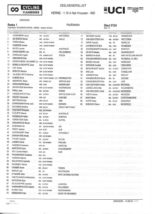 Les « DE MARKSPURTERS » ont rassemblé 72 concurrentes pour leur GP annuel. De nombreuses équipes composées de coureuses de plusieurs nationalités ont pris le départ de la « Salle Paroissiale » dans le centre de HERNE. L’organisateur proposait un parcours assez dur. De plus, il avait mis le paquet en donnant des primes en quantité. Les dames ne se sont pas endormies. Chaque passage était un combat. A ce jeu, le team « LA SWEAT » USA a fait fort lors des sprints. La course a débuté par la perte de plusieurs dizaines d’éléments. Un écrémage. Puis, tout s’est stabilisé malgré quelques tentatives de prendre le large. Enfin, elles sont onze échappées à se présenter pour la gagne. Maeve PLOUFFE « DSM-FIRMENICH-POST NL » WT l’emporte devant VAN MECHELEN « BALOISE-WB LADIES » et BYE « COOP-REPSOL ». Le peloton arrive +/- 1 min 30 plus tard. DEBOUCK 4e peut se montrer déçue. Elle pouvait gagner. Bravo à toutes et à tous.