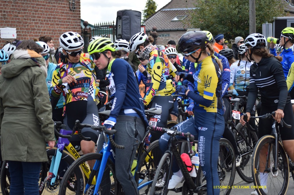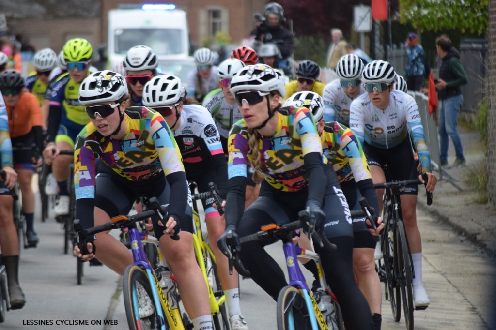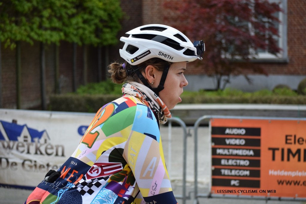 A HERNE (1.15-24/04), une Ă©quipe amĂ©ricaine Ă©tait sur la ligne de dĂ©part (club). Elle Ă©tait composĂ©e de : SIMONSON (CAN), DESROCHERS LAFLAMME (CAN) BONILLA ESCAPITE (MEX), COY (USA), MERCED (USA) et VALADEZ ORTIZ (MEX). Normalement, le groupe complet est constituĂ© de 14 coureuses. PANNECKOUCKE Aileen (BEL) est dans « LA SWEAT ». Nous vous invitons Ă visiter leur site web. Il possède un super design. Ainsi, vous pourrez y prendre connaissance de leurs motivations. Une fois attablĂ©s, nous avons discutĂ© avec une dame qui est la maman de l’une d’elles. Il semblerait qu’il s’agisse d’universitaires. Les maillots (top) ont Ă©tĂ© conçus par « SANTINI » Ă partir de modèles des dix annĂ©es antĂ©rieures (dixit). Quant au vĂ©lo « CANNONDALE », il est magnifique avec ce mĂ©lange de couleurs.