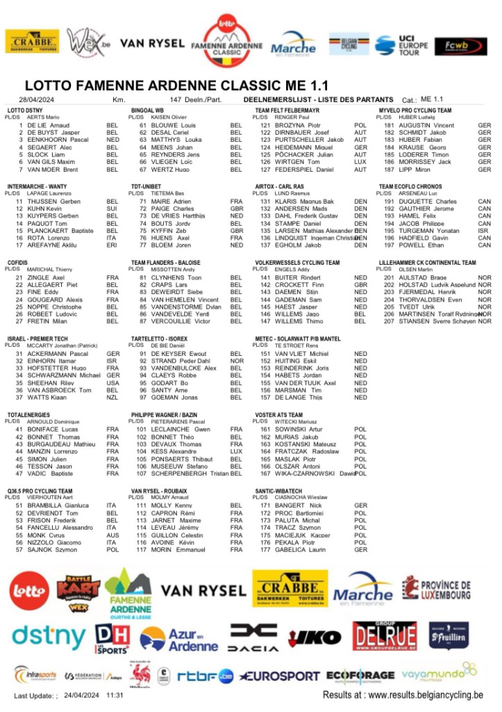 Bien entendu, ce 28 avril, c’est la « LOTTO-FAMENNE CLASSIC ». L’ASBL CYCLO CLUB LIBRAMONT-CHEVIGNY est à la manœuvre. Laurent MARS est Directeur de course. Le speaker est un certain Freddy HAVELANGE. Et on retrouve Arnaud GUILLAUME dans la caravane publicitaire. Le monde est petit !!! Sans omettre Wim OMLOOP et Rudy PLOMB sur des motos officielles. Pascal PIETERARENS sera à la tête de l’équipe « PHILIPPE WAGNER-BAZIN » comme DS. Vous vous souvenez tous de la « danse des canards » exécutée par Arnaud DE LIE, lors du sprint, de l’an dernier ? Et bien, il sera de retour après sa brève maladie. Pour un second round, il faudra peut-être attendre un peu. Le programme est alléchant.
