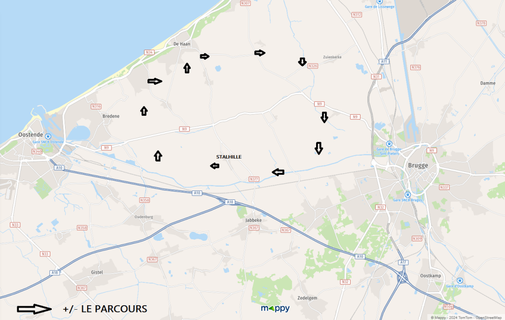 Le circuit : Très belles routes. Dans les Polders. Tranquilles. Fléchage top. Juste que cette contrée entre DE HAAN-BRUGGE et JABBEKE nous est connue de longue date. Peu de découvertes. Mais c’est un plaisir renouvelé : VLISSEGEM (vieux cafés), DE HAAN (extérieur ville), HOUTAVE (l’ancien centre), LE CANAL GAND/BRUGES/OSTENDE (un RAVEL magnifique), LE NOUVEAU PONT (une œuvre d’art), … . Météo : Vent fort. 17°. Grand ciel bleu.