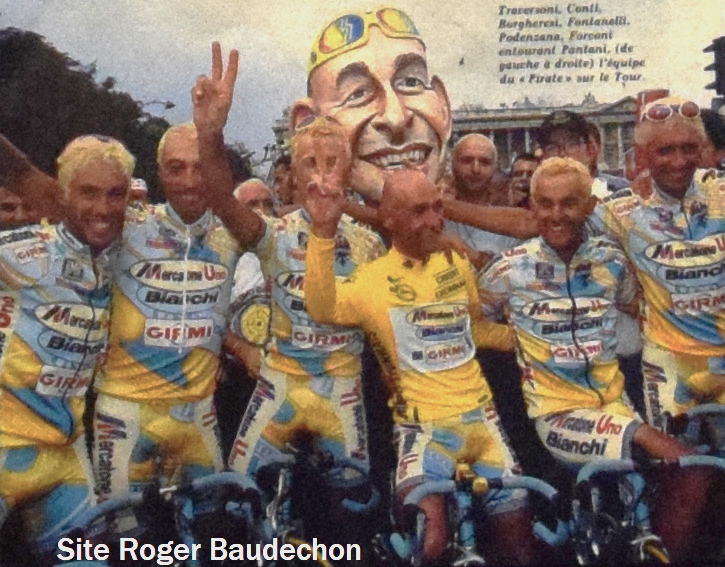 Marco PANTANI, « EL PIRATA », est décédé en 1970. Il avait 34 ans. Une tragédie. Une personnalité hors du commun. Attachante. Un attaquant, survolté lorsque la route grimpait. Il est impossible de résumer la vie et la carrière de PANTANI, tant elle est riche en événements joyeux et tristes. A « LCOW » nous ne retenons que le positif. Il a été professionnel de 1992 à 2003 au sein des équipes suivantes : « CARRERA JEANS-TASSONI », « MERCATONE UNO » et variantes nombreuses, « SCANAVINO-LA VERVE » et « MERCATONE UNO-SCANAVINO ». Il a connu les équipiers suivants : ABDUZHAPAROV, BONTEMPI, MEYVISCH, ROCHE S, TAFI, TETIERIOUK, CHIAPUCCI, CHIESA, SORENSEN, les ZBERG, LUTTENBERGER, MICELI, SIMEONI, BOTTARO, CONTI, SIBONI, FONTANELLI, GARZELLI, VELO, ANDERSSON M, ASTARLOA, PODENZANA, DE PAOLI, SAVOLDI, CIGANA, FOIS, SGAMBELLURI, SOLER, CODOL, … . A son palmarès : 1 x « TOUR DE FRANCE », 1 x « TOUR D’ITALIE », des étapes sur les grands tours, 3e du « TOUR DU TRENTIN », 1er du « TOUR DE MURCIE », 1er « ROMINGER CLASSIC », 4e du « CRITERIUM INTERNATIONAL », 3e des CHAMPIONNATS DU MONDE, 3e de « LA POLYNORMANDE », … . Peu de présence sur les classiques. PANTANI ne laisse personne indifférent. Dans son pays, il est toujours considéré comme une idole. Il a des stèles, des épreuves cyclistes à son nom, une rue, … . Il marquera encore plusieurs générations de cyclistes. Souvenons-nous !!!