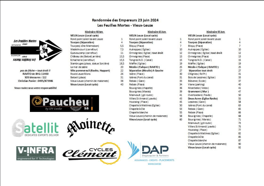 MichelG nous a fait parvenir les trajets de « LA RANDONNEE DE L’EMPEREUR » – annoncée précédemment – du club des « FEUILLES MORTES » de VIEUX-LEUZE (Leuze-en-Hainaut). La journée s’était tenue le 23 juin. Le 95 km passait à OLLIGNIES, B-D-L, DEUX-ACREN, … . Direction le MUUR !!! Nous avions vu les flèches.