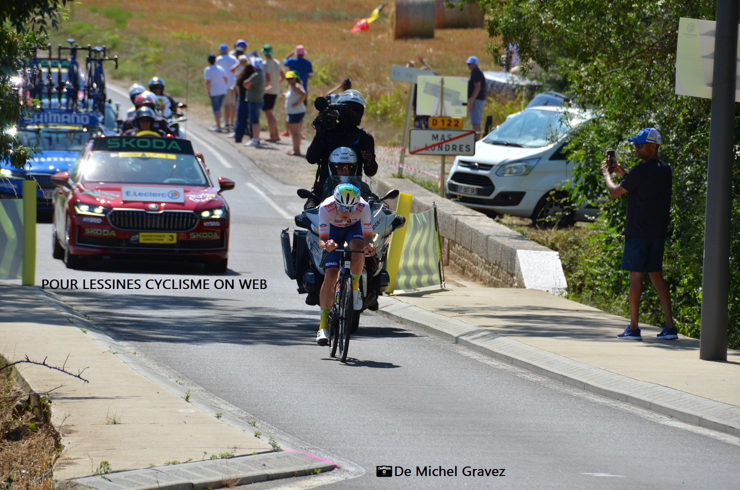 Depuis quelques années, « LCOW » a toujours un équipier (au moins) qui fait acte de présence sur une étape (ou plus) du « TOUR DE FRANCE ». Nous restons fidèles à l’épreuve. Ainsi, MichelG s’est rendu sur l’étape 16 du 16 juillet 2024. Elle reliait GRUISSAN à NÎMES. Soit 188.6 km. Ce n’était pas la plus rude – quoique – mais elle a été animée. Il s’était placé hors des monts afin de ne pas se retrouver dans la foule. C’est à proximité de MAS-DE-LONDRES (un rien au Nord de MONTPELLIER) qu’il a trouvé son bonheur. Un paysage de Provence. Tout d’abord, il y a le traditionnel et attendu passage de la caravane + aléas. Les gadgets volent autant que les virevoltants se trouvant aux alentours. Tous se jettent sur les objets « sacrés » avec égocentrisme. Attention danger. Il en reviendra avec quelques belles pièces. Des enseignes mondiales ne ciblent que les propriétaires de camping-cars (drapeau – grand maillot – pare/soleil). C’est sous un grand soleil et donc, la chaleur, qu’il attendra patiemment les coureurs. Il fera la connaissance d’un néerlandophone qui lui donnera d’ailleurs un maillot VERT « SKODA » (+/- 2.5 m x 1.5 m). Enfin, les premiers véhicules arrivent. Les motos klaxonnent. Les gendarmes, en poste fixe, prennent position. C’est l’effervescence. Un coureur : Thomas GACHIGNARD (très en vue sur les classiques – sur site) passe avec plus de deux minutes d’avance sur un peloton qui contrôle pour ses sprinteurs. La vitesse est impressionnante. Les voitures suiveuses ferment la marche. Une longue attente pour voir , tout au plus, 15 minutes (caravane et course) de la GRANDE BOUCLE. L’attente n’est rien. C’est le plaisir qu’en retirent tous les mordus de cyclisme qui est le plus important. Tous avaient la banane. Fatalement, MichelG a passé une journée ⭐⭐⭐ dans ce bled perdu au milieu de nulle part. Il remercie particulièrement ce nomade belge – va d’étape en étape – qui lui a donné le maillot géant !!! Ainsi que les coureurs pour le spectacle proposé.