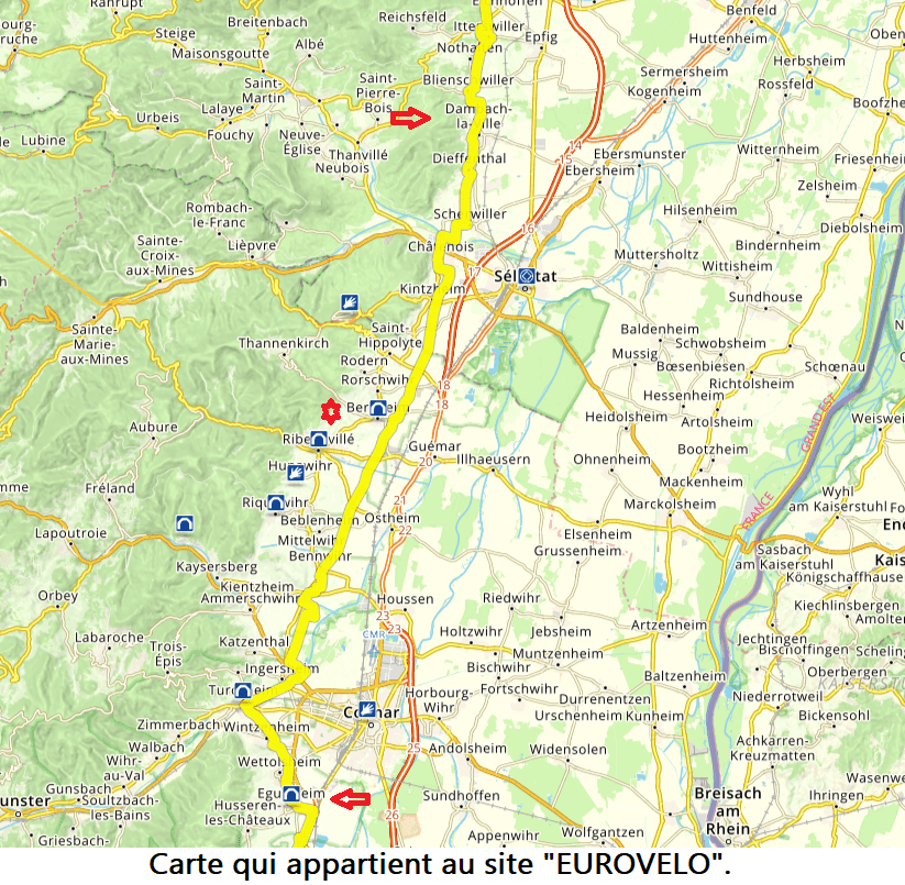 Voici une toute petite partie de « LA VELOROUTE DU VIGNOBLE » alsacien. De nombreux sites en font une démonstration très professionnelle. Idem pour « EURO 5 » qui dispose des outils ad hoc. La première et la seconde se confondent sur plus d’une centaine de kilomètres. A faire.