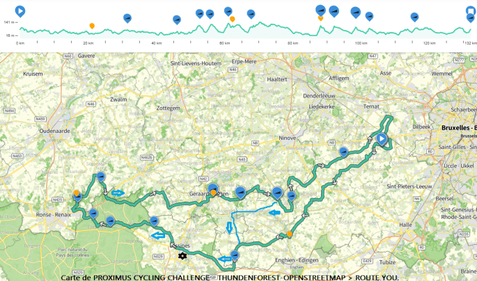 - 3. MONT – max 7.2 %. Toute la montée de la gare à ELLEZELLES à partir du bas. Après les lacets, à gauche deux fois. Près du pont du RAVEL, à droite vers RENAIX-MUZIEKBOS.