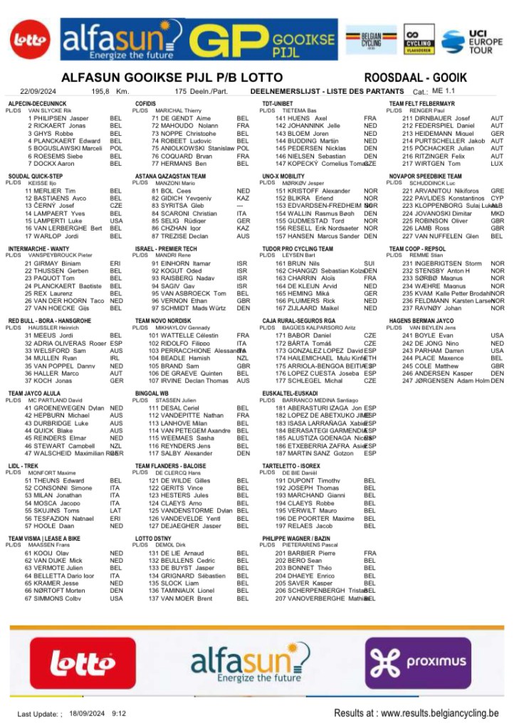 La « GOOIKSE PIJL » déménage de HALLE vers ROOSDAAL. Le « WIELERCLUB GOOIK SPORTIEF » permet de rester dans un périmètre géographiquement plus accessible. Départ et arrivée sont proches. Moins de 25 km de LESSINES. Il est même possible de voir les passages à hauteur de VOLLEZELE. Plusieurs teams de pointe (9 WT) sont annoncés.
