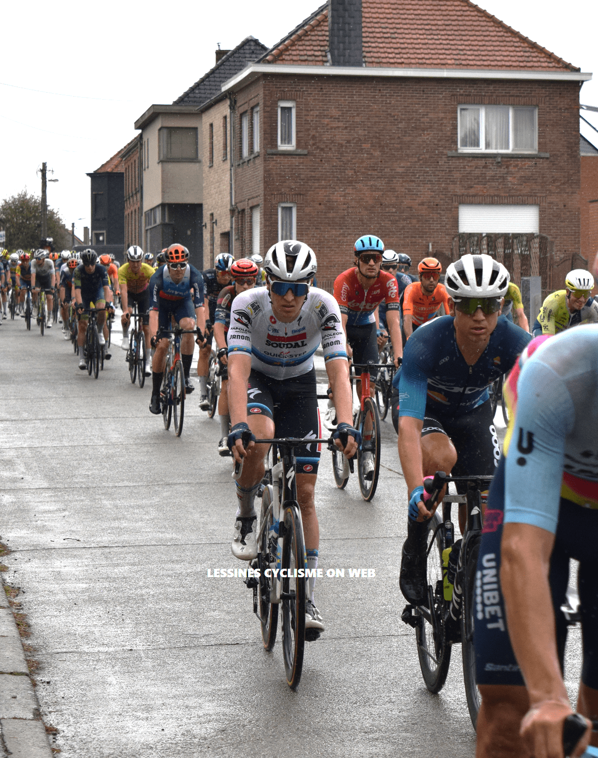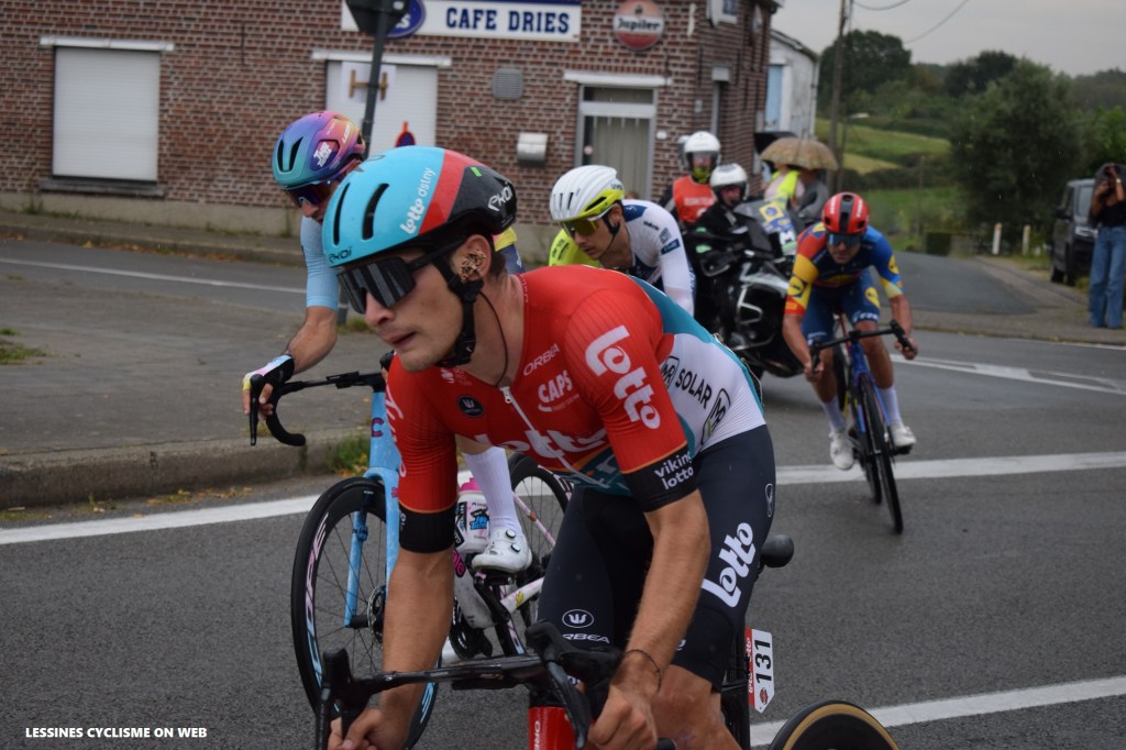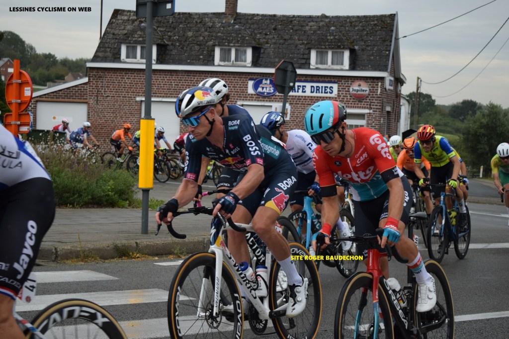 Quelques passages à hauteur de VOLLEZELE. Météo changeante : 21-22°, fine pluie, temps très gris, routes glissantes. Le public n’a pas manqué de regarder la compétition. Durant notre présence, il y avait une échappée de quelques coureurs. Deux autres étaient intercalés. Puis, il y a eu un regroupement à l’avant (-1). Le peloton ne laissait rien trainer. Les « SOUDAL-QUICK STEP », « ASTANA », « VISMA-LEASE A BIKE » et « TUDOR » réalisaient une grande part du boulot. D’autres comme « RED BULL-BORA-HANSGROHE » et « UNO-X MOBILITY » n’étaient pas en reste. « FELT FELBERMAYR » et « COOP-REPSOL » faisaient preuve d’initiative. Nous n’avons pas assisté à l’arrivée. Le résultat final est logique. Tim MERLIER roulait dans du beurre. Comme vendredi à KOOLSKAMP. Son second Jordi MEEUS est en condition. KOOIJ a souvent été positionné derrière. Ses équipiers veillaient au grain. Il prend néanmoins la troisième marche du podium. La « GOOIKSE PIJL » est une très belle épreuve qui s’est roulée sur un circuit compliqué et dans des conditions météorologiques difficiles. Mieux que les CM à ZURICH !!!