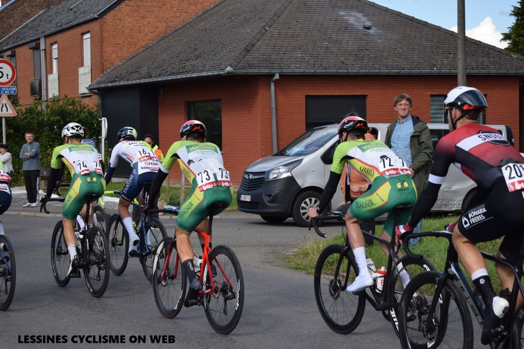 L’épreuve proprement dite. Après une grande boucle de +/- 60 km, les coureurs arrivent en vue de la flamme rouge vers 15.10 – tout juste dans les délais. Le néerlandais VEENINGS – « DIFTAR CONTI TEAM » – mène la danse avec 100 m sur l’anglais STEWART – « CORRATEC-VINI FANTINI ». Le peloton est emmené par VANDENBULCKE, DE JONG, STOCKMAN, LAMBRECHT, MADSEN, KROONEN, … . Les « PHILIPPE WAGNER-BAZIN » sont en attente. Petit à petit les choses se décantent. Une échappée se forme mais elle n’aura jamais un écart suffisant que pour se mettre à l’abri. Enfin, ils sont une quarantaine à tenter leur chance dans l’emballage final. Sente SENTJENS (19 ans) – « ALPECIN DECEUNINCK DEVELOP » – Champion de Belgique des ESPOIRS est très en vue ces dernières semaines. Il remporte le sprint devant l’expérimenté Tom VAN ASBROECK et Andreas STOKBRO. Vous pouvez suivre le résumé du « GP CERAMI » sur TELE MB qui était sur place. Public nombreux pour « voir passer les coureurs ». Bravo aux organisateurs.