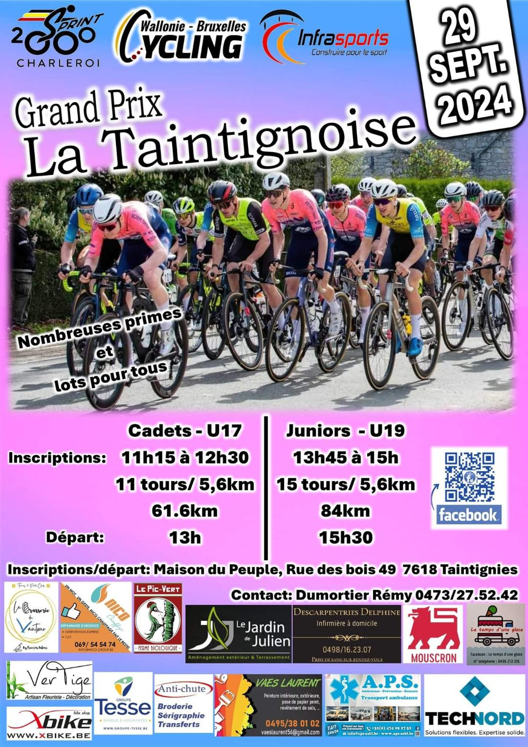 « SPRINT 2000 CHARLEROI » mettait sur pied une sérieuse journée de cyclisme à TAINTIGNIES. C’était le 29 septembre 2024. CADETS, JUNIORS, DAMES étaient au programme. Le tout, au départ de la « MAISON DU PEUPLE » du village. Un lieu habituel occupé par les « RDD » (cyclos) du Champet’. Une animation qui a attiré du monde.