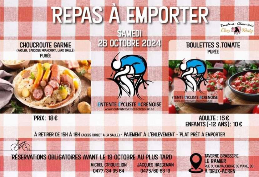Le 26 octobre 2024, « L’ENTENTE CYCLISTE ACRENOISE » organise son « REPAS A EMPORTER » Ă LESSINES. Toutes les formalitĂ©s se trouvent en entĂŞte.