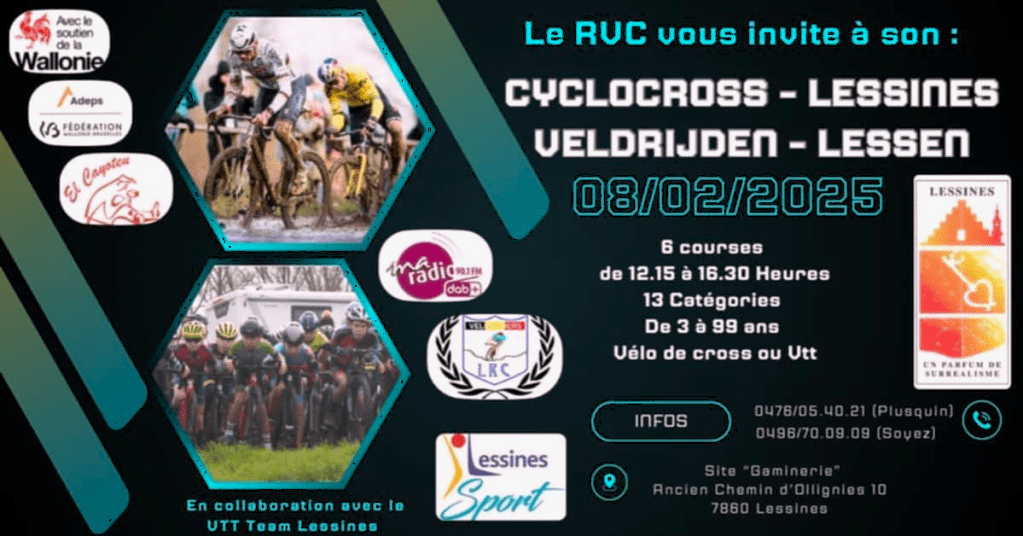 Le 9 février 2025, le « VTT TEAM LESSINES » organise une « ENDURANCE VTT DE 02H30 » (adultes > SOLO et DUO – VTT et VAE en classements séparés) à 13h00, ainsi qu’un « 30 MINUTES » pour les KIDS (SOLO) à 10h30. Ces épreuves sont ouvertes à tous ! Les sites de LA GAMINERIE, de l’IPAM (salle) et de la BUTTE DU SYNDICAT ont été choisis pour les formalités et le parcours. Vous pouvez d’ores et déjà visiter « CHRONOLAB » (site web), le chronométreur officiel, qui s’occupe des transpondeurs et des inscriptions en ligne. Des buvettes et des food trucks seront présents sur place. Les podiums auront lieu après les épreuves. Ce sera une première expérience, tout comme pour le « RVC » et le cyclo-cross. Nous reviendrons début janvier 2025 pour vous fournir plus de détails. Le samedi, le « VTT TEAM LESSINES » prêtera main-forte au « RVC », et les rôles seront inversés pour le « VTT » du dimanche.