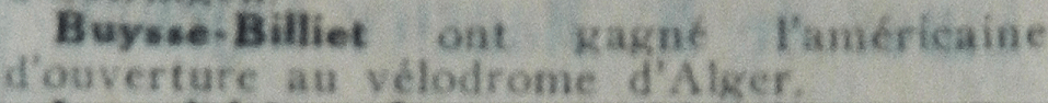 Albert BILLIET (né à Gand, ✝ 69 ans) est probablement le coureur pour lequel les recherches ont été aussi longues. Peu de classements « route » sont disponibles à son sujet. Par contre, en ce qui concerne les « SIX JOURS », il est régulièrement cité. Bien qu’ayant été routier, il semble avoir choisi la piste, une discipline qu’il appréciait particulièrement. D’ailleurs, cette dernière vivait véritablement de beaux jours. Nous l’avons déjà mentionné à plusieurs reprises : dans un périmètre de 15 km autour de Lessines, il y avait une douzaine de vélodromes, surtout en plein air. BILLIET n’était pas le seul à pratiquer cette spécialité. Des coureurs comme Piet VAN AMSTERDAM, Georges PAILLARD ou Emile DIOT partageaient la même optique. Il ne faut pas oublier que ces pistards participaient aux « SIX JOURS » de Chicago, Berlin, Londres, Paris, New York, Montréal, Copenhague, etc. Un « SIX JOURS » ne se résumait pas à quelques heures de course comme c’est le cas de nos jours. Ils « roulaient » jour et nuit. Certains écrits rapportent qu’ils donnaient tout, surtout lorsqu’il y avait du public. Il est même mentionné que certains coureurs ont été vus en train de lire leur journal. A certaines occasions, un coureur se reposait pendant que l’autre roulait, et ainsi de suite. Dans certains textes, il est même indiqué que le spectateur venait simplement parce qu’il faisait chaud dans la salle ! Ou encore que des marchands venaient vendre leurs produits dans ou autour de l’anneau. BILLIET a été indépendant et professionnel dans les équipes suivantes (1929-1945) : « DILECTA-WOLBER », « DOSSCHE SPORT ». Il a côtoyé des coureurs tels que DE CORTE, BONDUEL, DE CALUWE, DELOOR, GIJSSELS, IGNAT, les MARTIN, MOERENHOUT, ROYER, SCHEPERS, BUYSSE Ach, GRYSOLLE, JOYEUX, NEAYE, PELISSIER Ch., ROSSEEL, VAN SIMAEYS, FOURNIER, SCHULTE, WALSHOT, WIERINCKX, etc. A son palmarès, on compte 12 victoires aux « SIX JOURS » avec différents équipiers : MARSEILLE (+ A. BUYSSE), PARIS (+ C. WALS), GAND (+ C. DEKUYSSCHER), SAINT-ÉTIENNE (+ O. DEBRUYKER), etc. Sur route : 10e de « PARIS-TOURS », 2e du « CHAMPIONNATS DES FLANDRES », 18e de « PARIS-ROUBAIX », etc. BILLIET n’est pas un inconnu. Souvenons-nous.