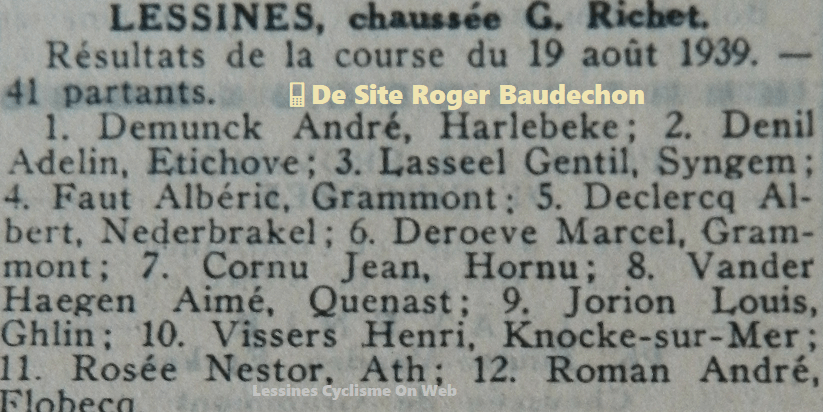 Par ailleurs, la catégorie en lice n’est pas mentionnée. Les participants : DEMUNCK ou ROSEE ne sont pas connus des amateurs de cyclisme. Il n’y a pas un seul lessinois dans la liste alors qu’en même temps, les « NON LICENCIES » roulaient par dizaines dans les différentes communes de ce qui n’était pas encore notre entité.
