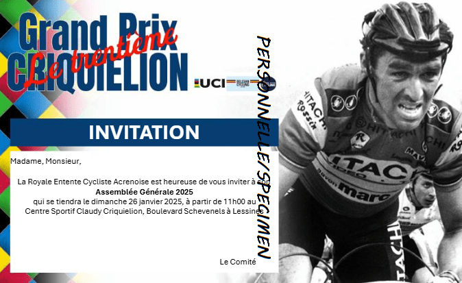 Avec nos remerciements Ă Laurent HAEGEMAN (PrĂ©sident) et Michel CRIQUIELION (SecrĂ©taire) pour l’invitation qui nous a Ă©tĂ© transmise par « LA ROYALE ENTENTE CYCLISTE ACRENOISE ».