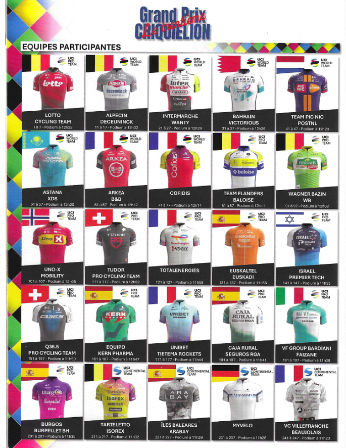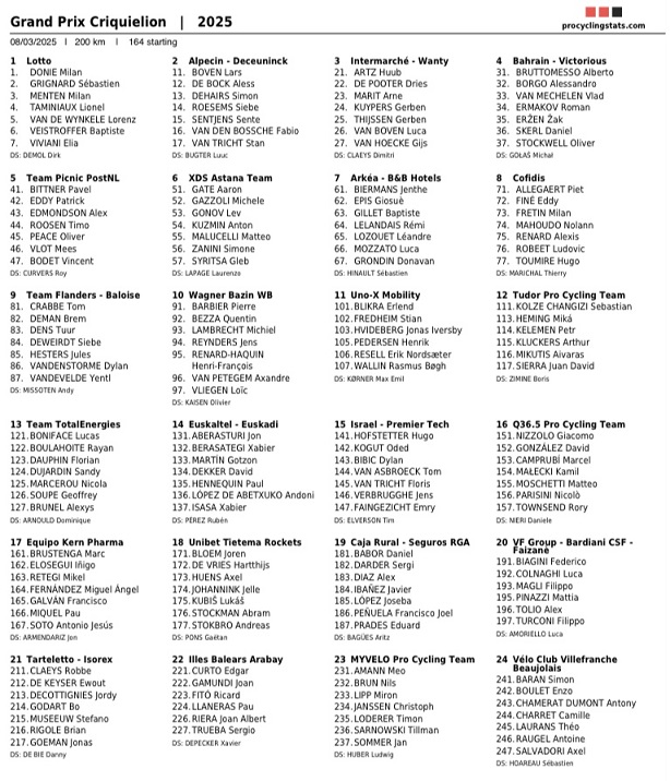 08/03/2025. La liste n’est pas (encore) disponible sur « BELGIAN CYCLING » mais bien sur « PCS CYCLING », site sur lequel vous pouvez suivre toute l’Ă©preuve.