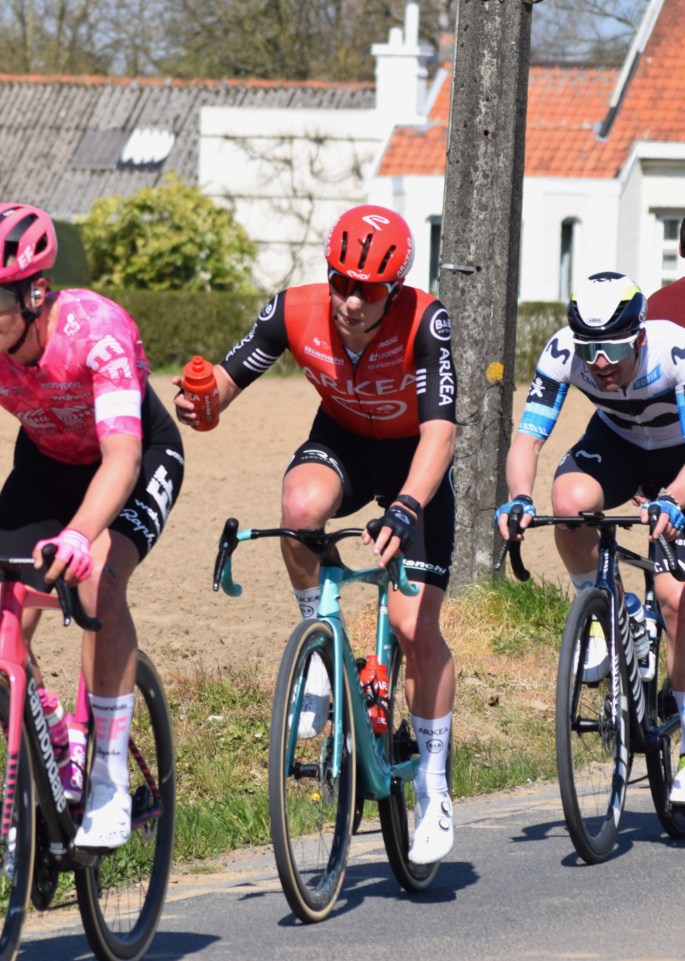 Le bidon placĂ© en entĂŞte est de LĂ©andre LOZOUET (Natif de Cherbourg – 20 ans – « ARKEA – B&B HOTELS »). Il a Ă©tĂ© lancĂ© Ă nos pieds au-dessus du BERG TEN HOUTE (Schorisse). Par chance, nous avons pu le ramasser Ă temps. En effet, des « sauvages » n’hĂ©sitent pas Ă vous sauter dessus pour en prendre possession avant mĂŞme que vous ne vous baissiez. Ce fut le cas d’un « VISMA ». Merci au coureur pour l’envoi. Portrait !